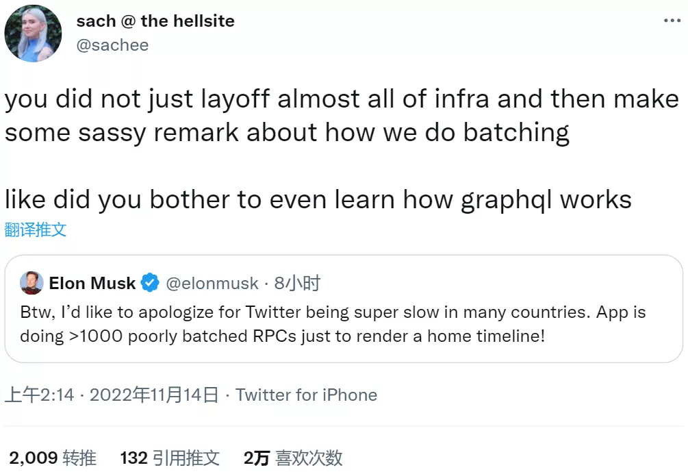 Twitter的技术主管怼马斯克不懂 GraphQL后,被当场开除!2022年11月20日 · 阅读需 1 分钟猿1993👨🏻💻🥇后端打酱油程序猿ᴴᵉˡˡᵒ ᵂᵒʳˡᵈ「暖男」「奶爸」o(*≧▽≦)ツ 🎉🎉前几天的事情,马斯克收购了Twitter。然后评 Twitter App 滥用 RPC ,结果技术主管直接在线回怼:“说马斯克不懂技术,瞎BB“ 还有一位负责 Twitter Android 客户端开发的工程师 Eric Frohnhoefer 也是在线回怼: 结果就是他们被解雇了! 先不说技术到底对不对,通常情况下只有职场小白才会做这种事情。为什么一个技术主管能做出如此举动?我感觉他们已经做好了走的准备,然后就是一顿怼怼怼!