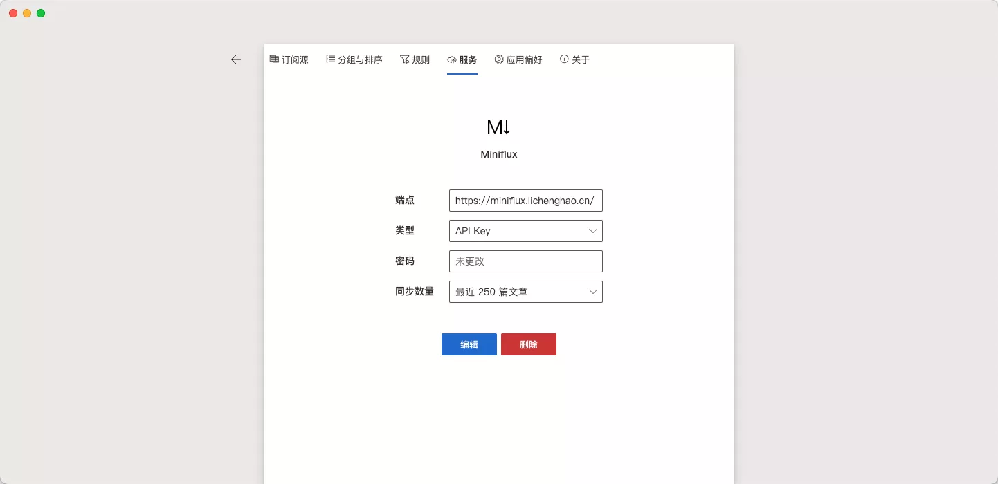 然后在设置——>API秘钥,新建一个秘钥,在 Fluent Reader 服务中添加站点及秘钥,即可同步订阅源了!