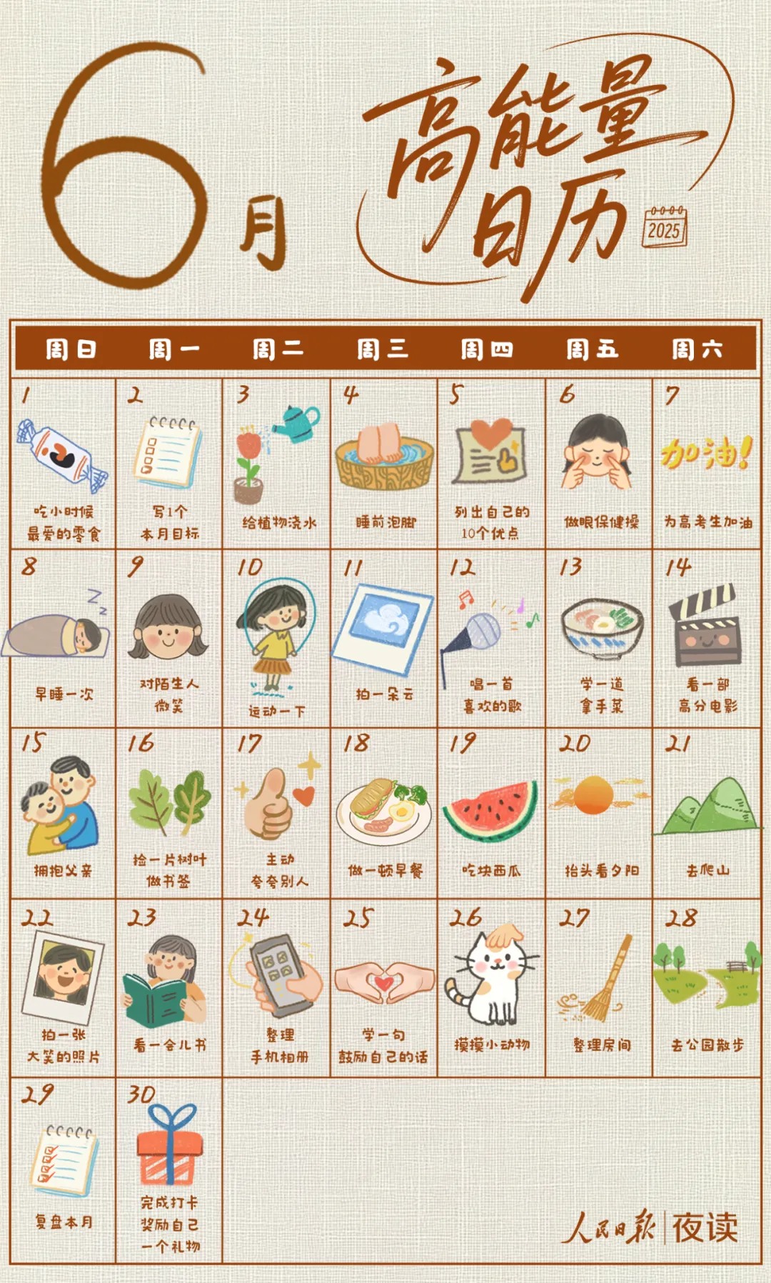 六月已经到来,如果你不知道干啥能变得开心的话,人民日报 1 天 1 件恢复能量的小事,给你安排好了。(虽然我才三十出头,但是 15 号的这件小事却永远都完成不了了)一定要珍惜当下的每一分钟。