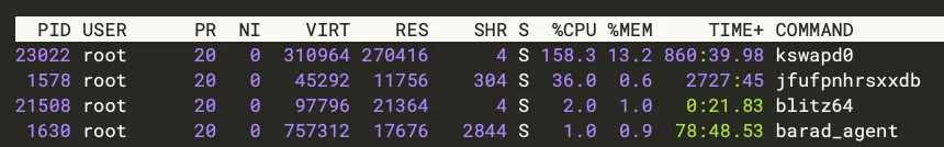 好家伙,这个服务kswapd0占用率这么高,肯定是有问题了!因为我的几个小服务不可能占用这么高,百度一下大概率是中毒了!