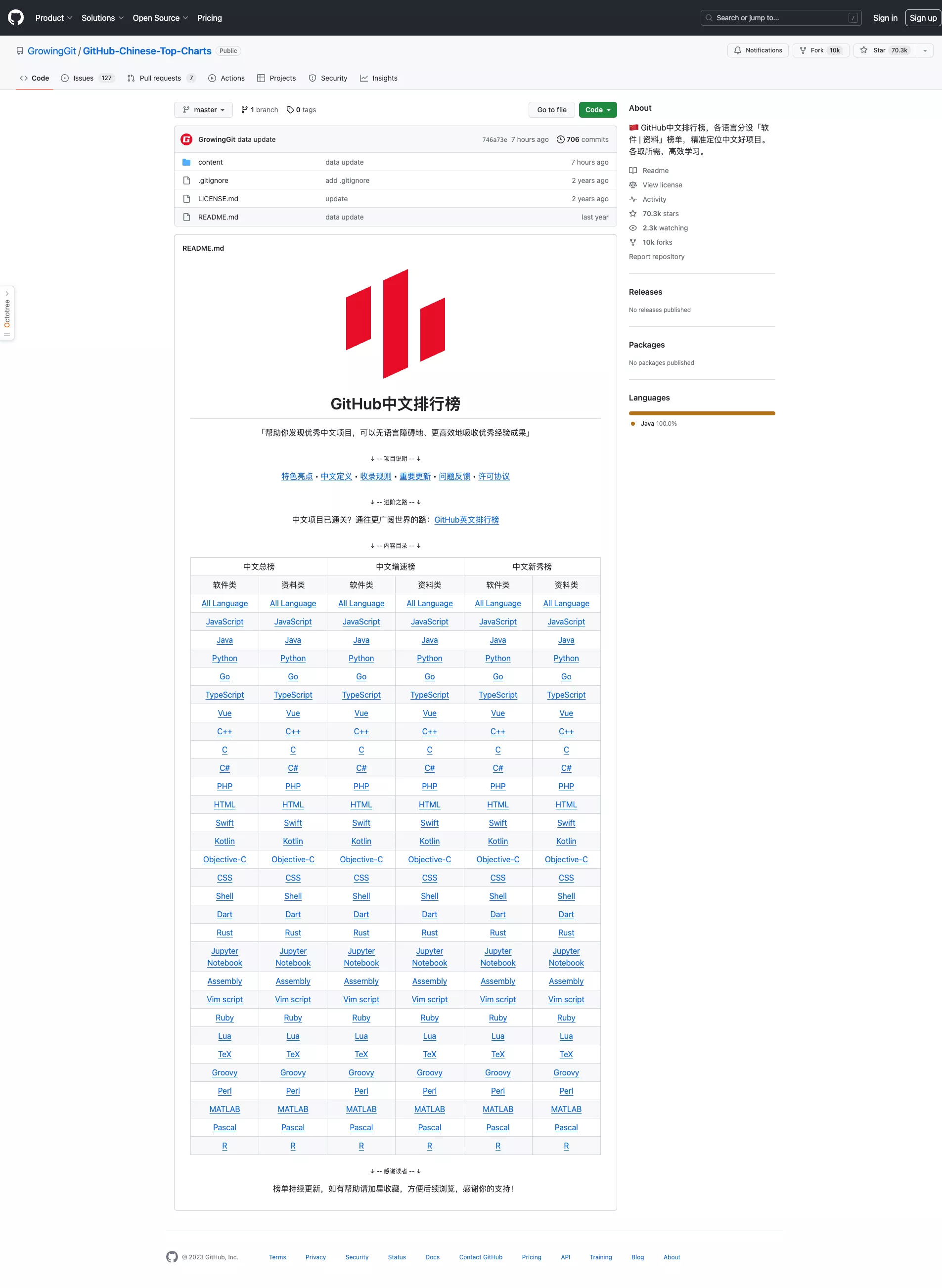 GitHub中文排行榜2023年11月28日 · 阅读需 1 分钟猿1993👨🏻💻🥇后端打酱油程序猿ᴴᵉˡˡᵒ ᵂᵒʳˡᵈ「暖男」「奶爸」o(*≧▽≦)ツ 🎉🎉该开源项目整理了中文、或者文档有中文翻译的开源好项目。 https://github.com/GrowingGit/GitHub-Chinese-Top-Charts