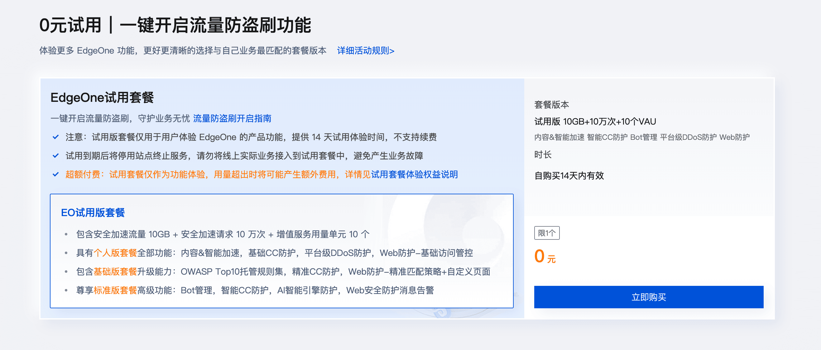 最近这个腾讯的 EdgeOne CND 也是火了起来。这不七月份开始公测了,里面有个免费的 CDN 套餐,很是吸引人。免费的套餐不是容易就能得到,不过不要紧,还有个试用的套餐:申请地址:边缘安全加速平台特惠_EdgeOne 优惠活动- 腾讯云