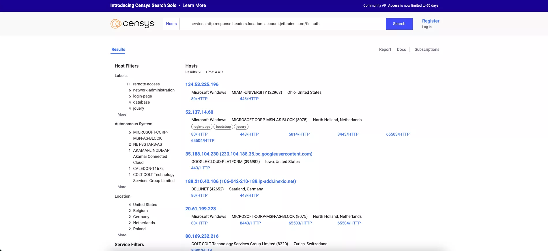 第 2 步:然后搜索框输入:services.http.response.headers.location:account.jetbrains.com/fls-auth