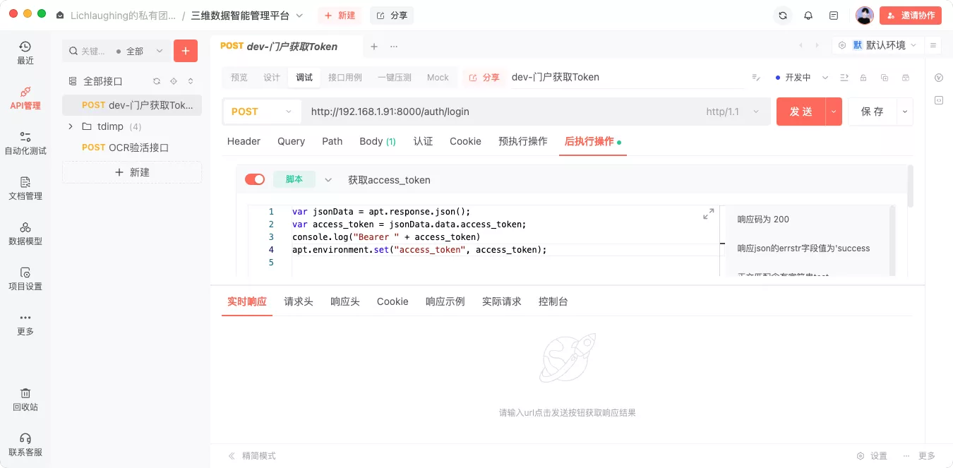 现在的接口工具,例如:Postman、ApiPost 等都支持请求的后处理器。请求接口完毕就可以把 token 放到环境变量中,其他接口就可以通过环境变量来取到这个值去使用。