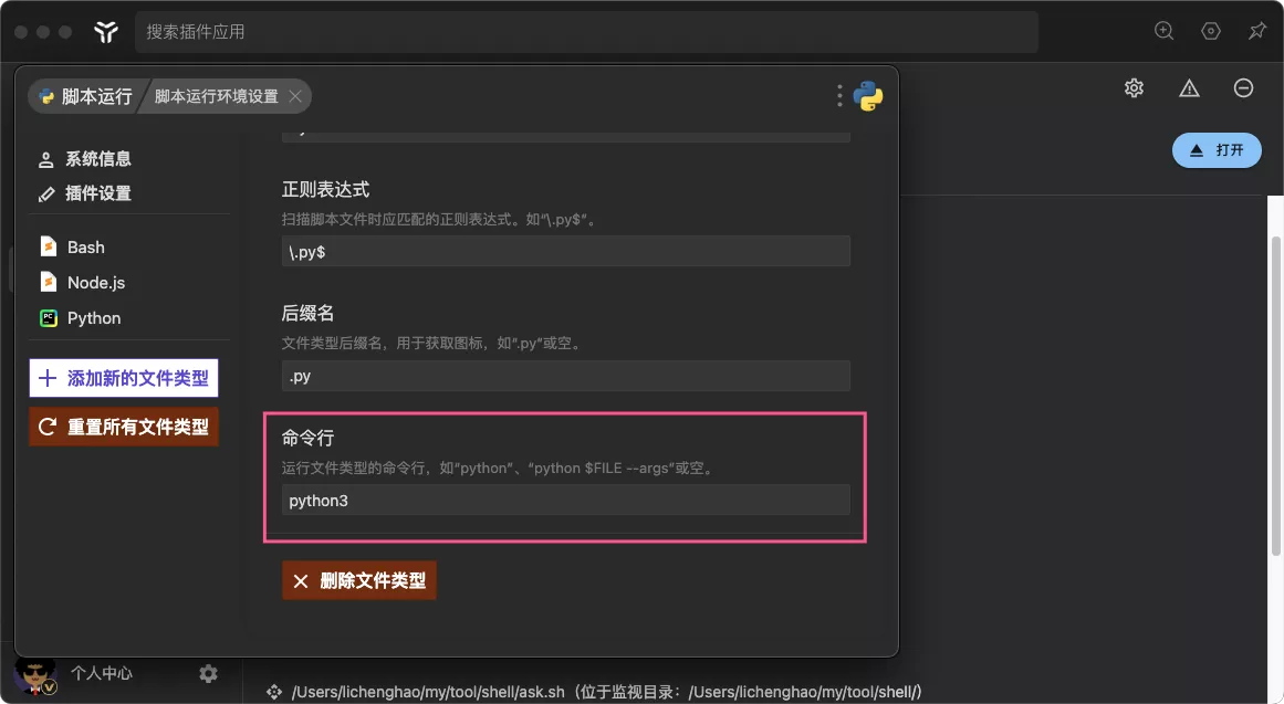 进入插件运行环境设置,将 python 的命令行设置为 python3(根据自身情况设置)