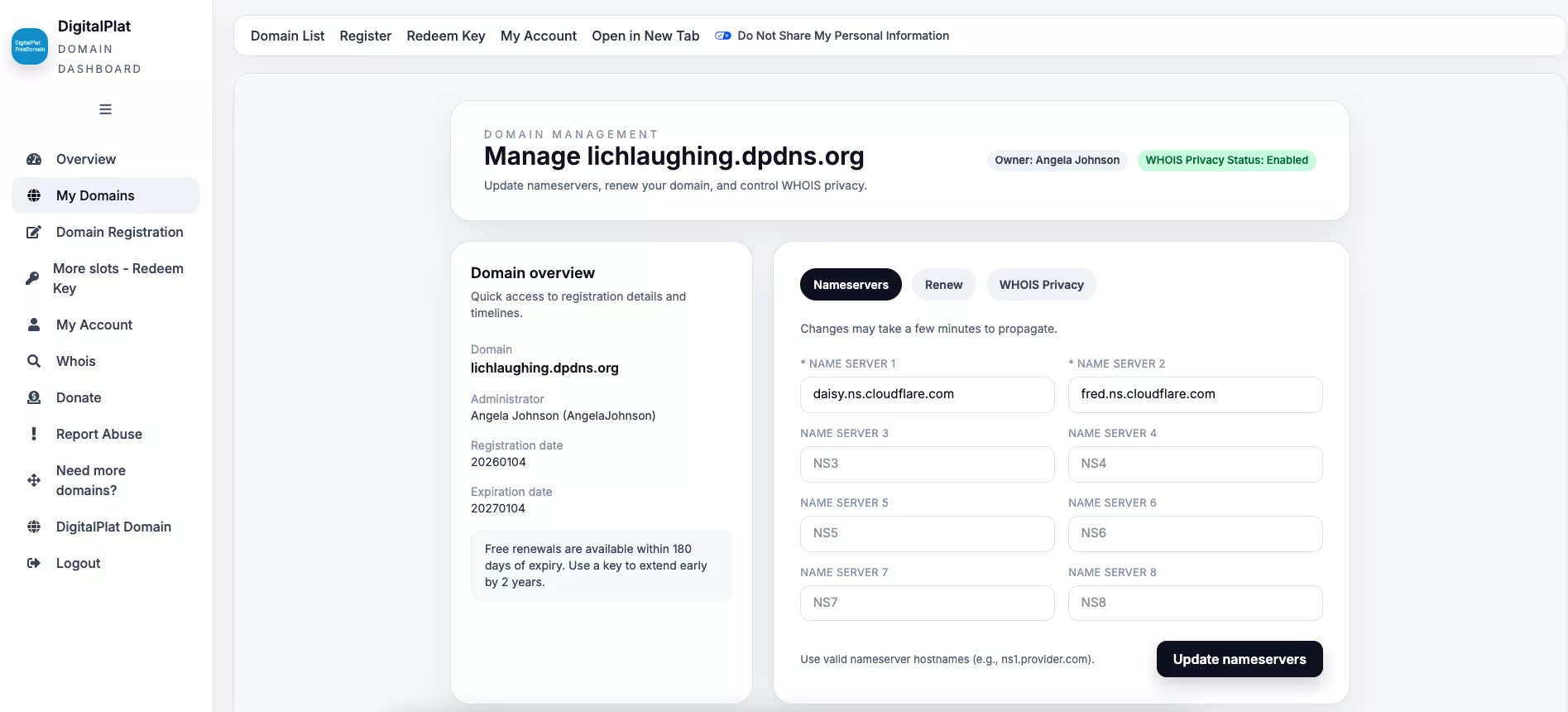 登陆以后,选择Domain Registration,选择一个域名后缀,输入想要的域名,认证的时候将Cloudflare的DNS服务器填写到Nameserver中即可。页面显示会等很久,实际也就十几分钟就能完事。